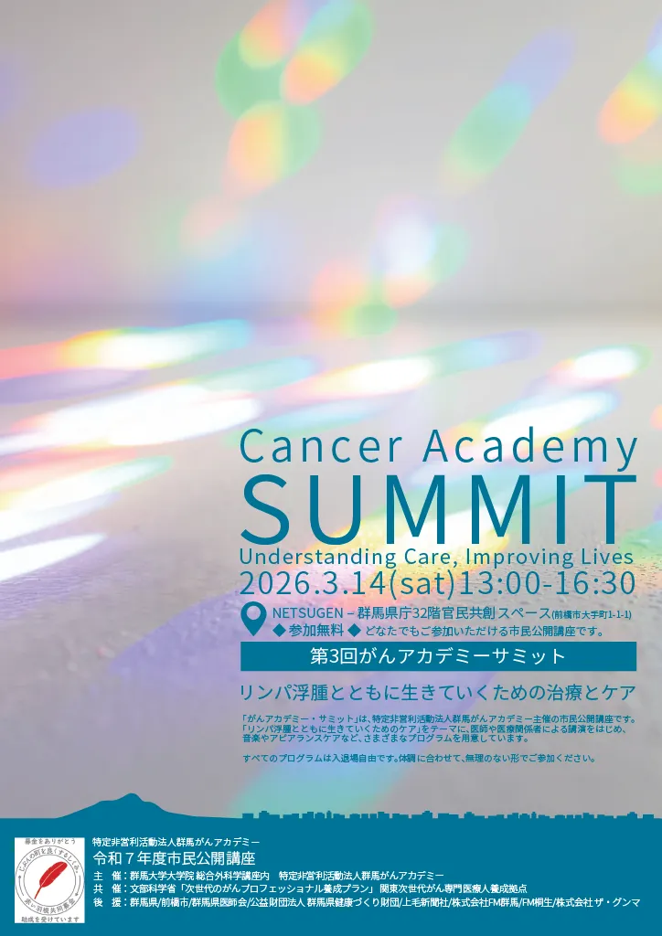 「がんアカデミーサミット」は特定非営利活動法人群馬がんアカデミーによる「医療」「文化」融合型市民公開講座です。