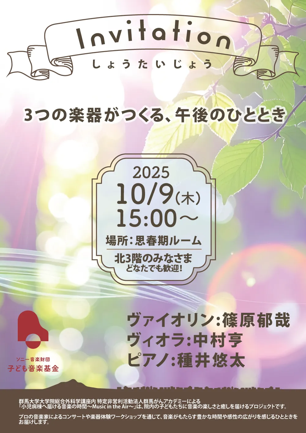 演奏を届ける中高生や医学生、音楽家たちと、それを受け取る子どもたち、そしてその周りにいるすべての人々。音楽は、その場にいる誰もが思いを共有し、静かな感動をともに味わえる“ぬくもり”の時間を生み出します。音楽を介して生まれるつながりが、心にやさしい記憶として残っていきますように。