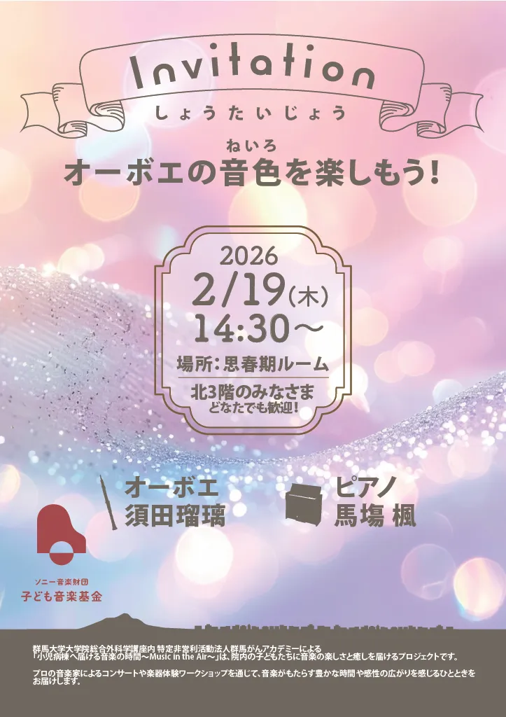 音楽はその一瞬を特別なものに変える力を持っています。演奏を耳にした子どもたちが思わず笑顔になり、ご家族やスタッフと共にその音を楽しむ姿は、私たちにとって何よりの喜びです。音楽のある時間が、心の余白を満たし、安心や希望へとつながることを願っています。そのひとときが、記憶にやさしく残り、明日を少し前向きに迎える力になりますように。