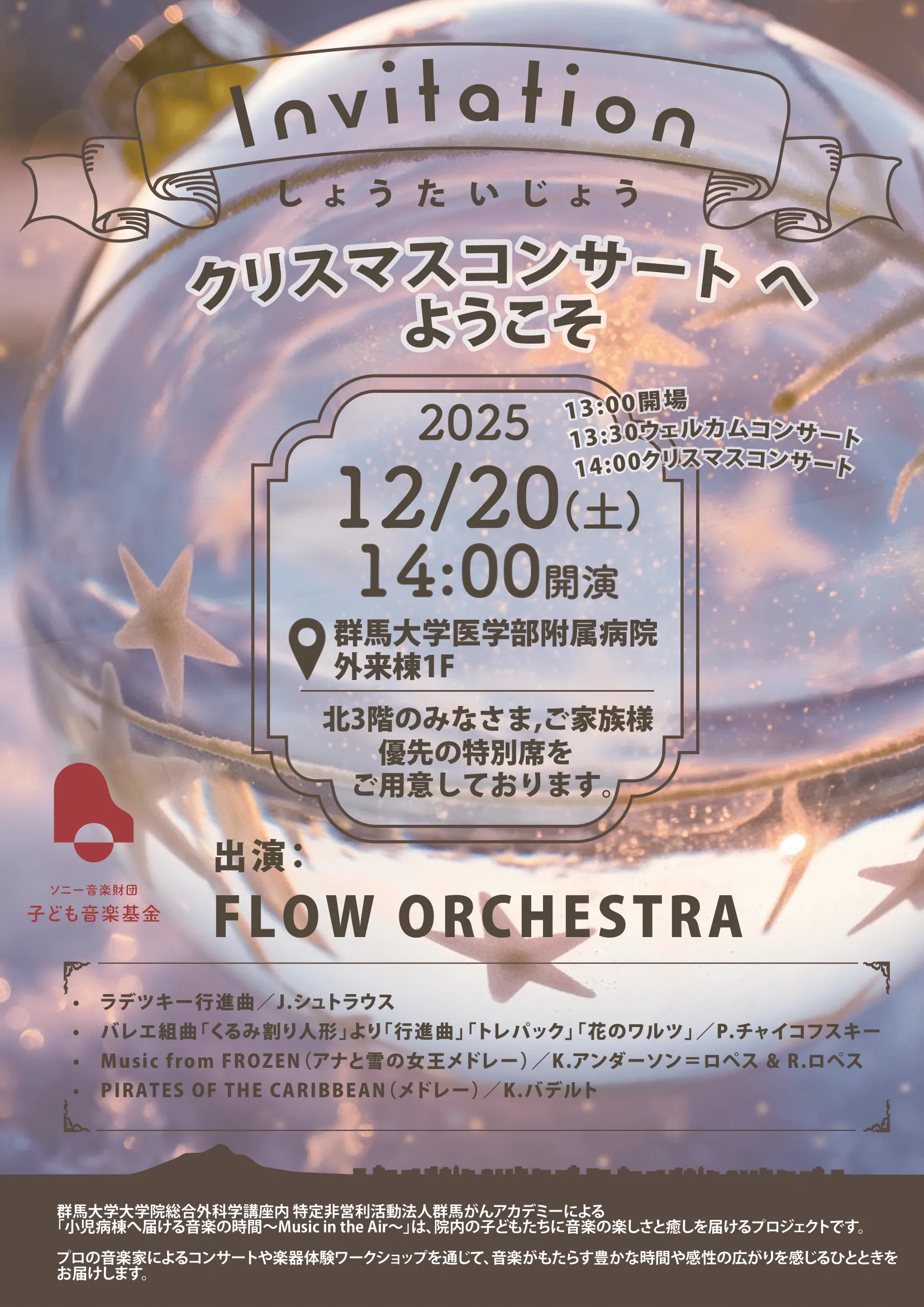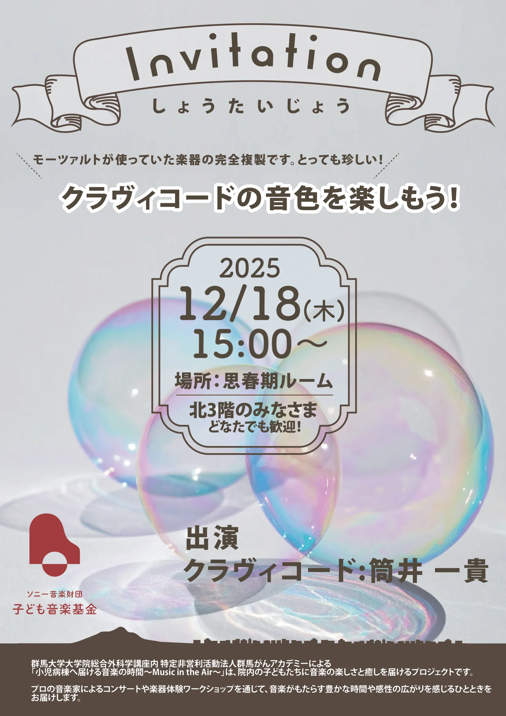 演奏を届ける中高生や医学生、音楽家たちと、それを受け取る子どもたち、そしてその周りにいるすべての人々。音楽は、その場にいる誰もが思いを共有し、静かな感動をともに味わえる“ぬくもり”の時間を生み出します。音楽を介して生まれるつながりが、心にやさしい記憶として残っていきますように。